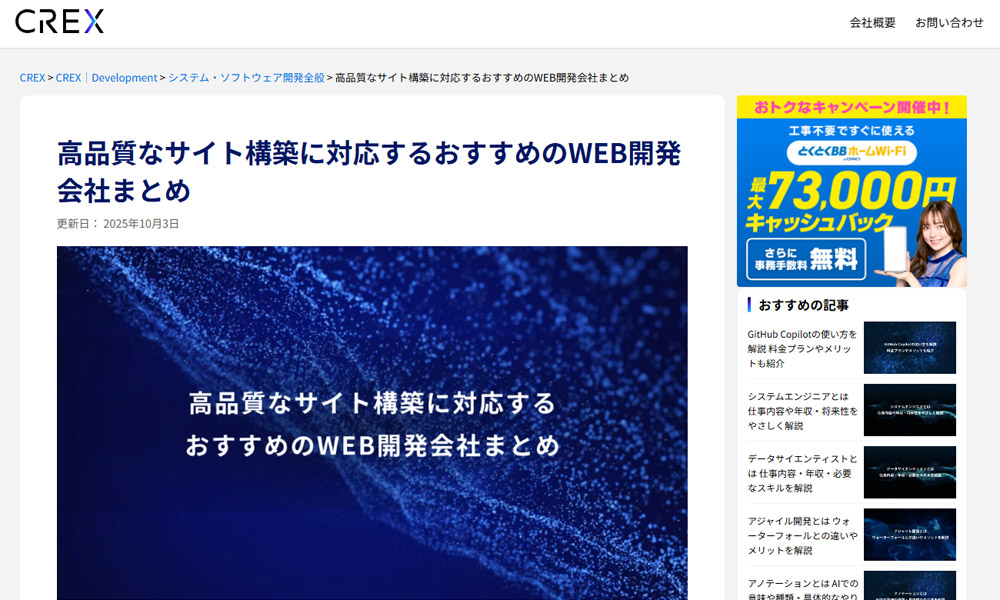 株式会社CREXの「高品質なサイト構築に対応するおすすめのWEB開発会社まとめ」と「機能と品質で選ぶおすすめのアプリ・システム開発会社を紹介」という記事に掲載いただきました。